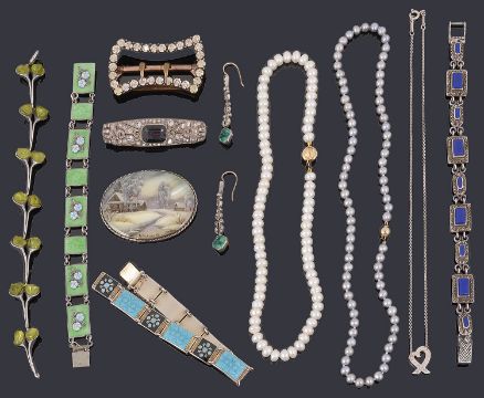 A collection of costume jewelleryto include of Art deco green paste and marcasite drop earrings, a sterling silver green enamel bracelet with applied enamel forget-me-knots, a Norwegian Bernard Meldahl silver enamel bracelet, black and blue panels decorated with snowflakes, a silver bracelet get with green freeform stones, two cultured freshwater pearl necklaces, a silver necklace stamped Tiffany and other costume jewellery items (qty)paste drop earrings: approx 4.4cmCondition: Paste brooch missing some stones, other items generally in good condition please ask for a condition report on individual items