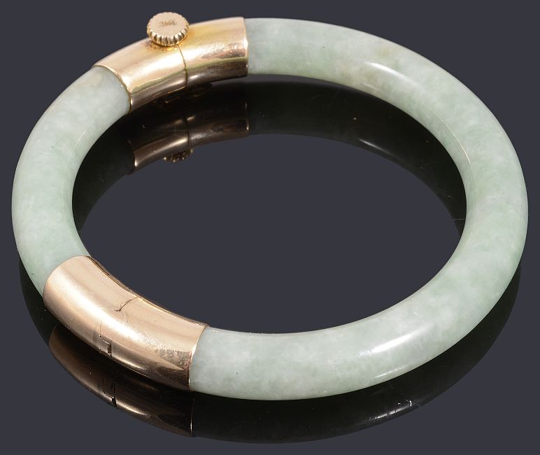 A gold jade set bangle of hinged designthe yellow gold mounts with screw clasp fittings, marked 18k but tests as approx. 14cttotal weight approx. 50gCondition: Inside mounts not gold, outside hinged sections tests as approx 14ct gold