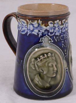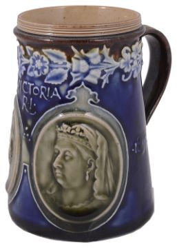 A small collection of Doulton stoneware to include a Doulton Lambeth Silicon vase decorated by Eliza Simmancefirst of squat baluster form decorated with flowers, incised ES, impressed marks and dated 1885, together with a pot pourri, impressed 7714, a gilt cauldron form vase, numbered 1904, a small mug commemorating the 1911 Coronation of George V and Queen Mary, a small pot with crimped rim, decorated by Elizabeth Atkins, etc., together with a Victoria Diamond jubilee commemorative mug (7)first height 16 cm. Condition: Fair condition, crimpe drim of pot with occasional slight chips