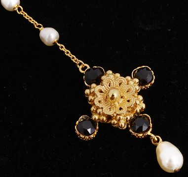 A Dolce and Gabbana simulated pearl and black paste rosary,black paste stones to a floral crucifix with a simulated pearl drop, to a simulated pearl necklace with original box and outer boxapprox length 44cmCondition: In excellent condition