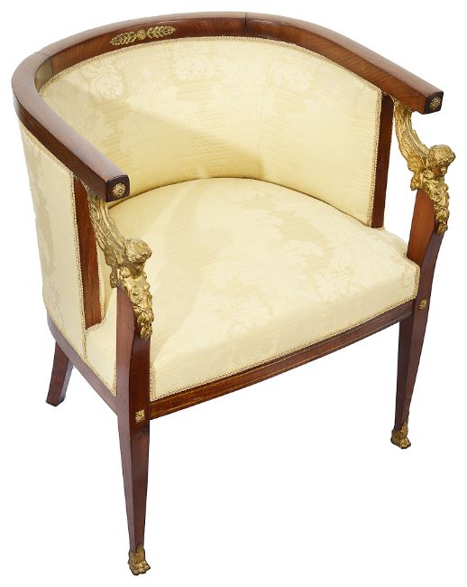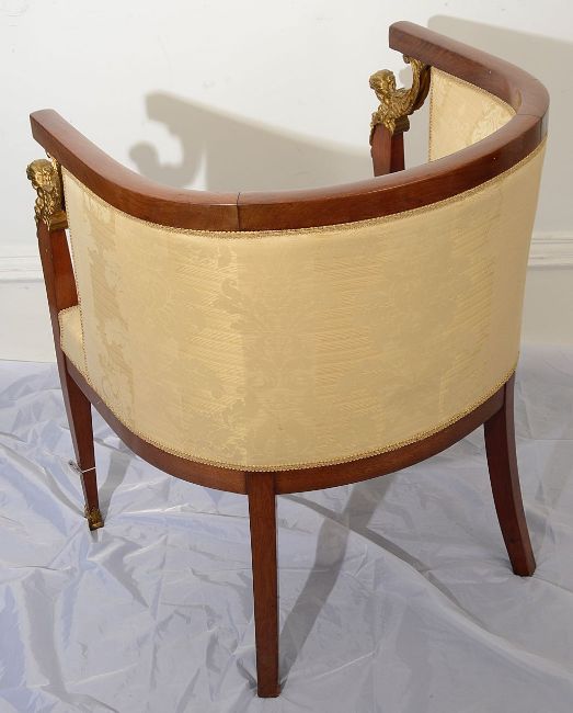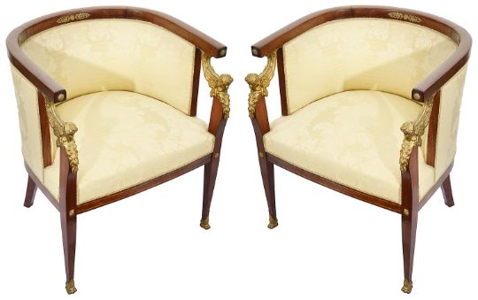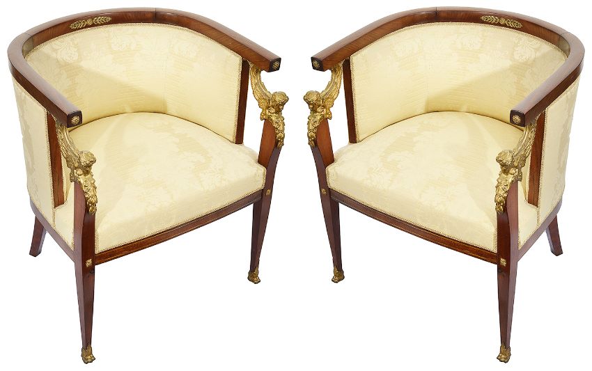A pair of late French Empire style mahogany framed tub armchairs with ormolu mounts c.1900 having curved top rail with flower boss mounts to terminals and padded backs and stuff over seats, the square tapering forelegs front legs headed by ormolu winged females masks and terminating in paw feet, (2)height 73.5 cm., width 62 cm., depth 52 cm.Condition: Good condition. Solid construction and clean upholstery Please note this lot needs to be collected and paid for by Friday 11th September 4:30pm