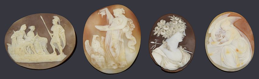 Four unmounted well detailed carved shell cameosto include two of Hebe feeding an eagle, both in different naturalistic settings, another beautifully carved example of a young maiden with roses in her hair and another carved with Roman warriors (4)largest cameo: 5.2cm, Condition: All in good condition. small chip to the outer edge of the maiden with roses cameo.