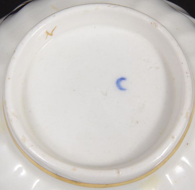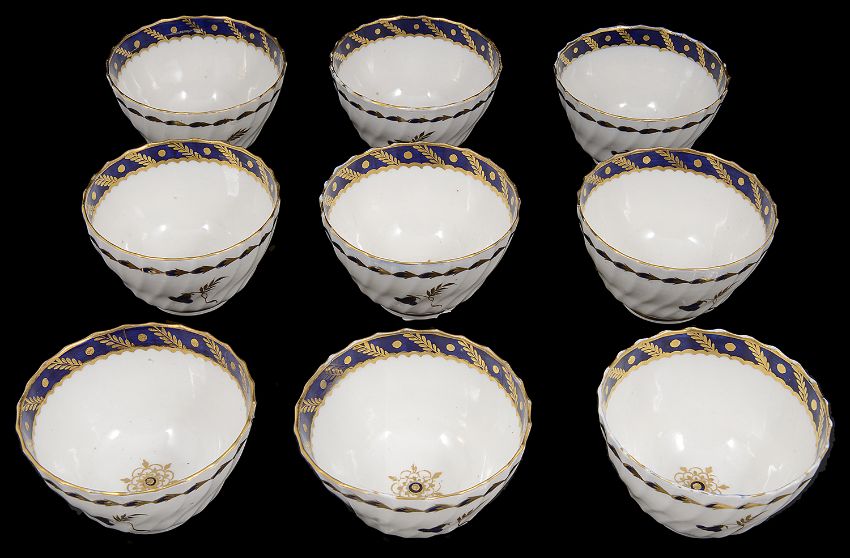 Nine Flight Worcester tea bowls c.1785spiral fluted and decorated in with a mazarine border in blue and gilt to inside of bowl and chrysanthemum to centre, the exterior with husk border and, three bell flowers, open crescent mark in underglaze bluediameter 8.5 cm.Condition: Fair condition. One with rubbed interior and very slight hairline to base of bowl. Some other mild rubbing to rims. Another bowl with chip to foot rim