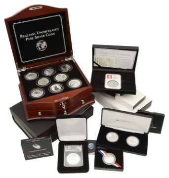 A collection of mostly cased silver and other proof coinscomprising nine uncirculated 1oz silver coins in a collectors chest, The Queen Victoria 1887 Golden Jubilee silver coin collection, an Edward 1 silver penny, a Richard I silver penny, a Henry III silver penny, British Virgin islands 2019 Pegasus & Una and The Lion silver proof diamond set 5oz 30 dollar coin, ibid., one dollar coin pair, The D-Day 75th Anniversary silver numisproof, The D-Day Leaders Silver proof £2 coins set, DateStamp UK 2019 Year of the Pig 1oz silver £2 coin., USA 2019 Apollo 11 50th Anniversary Commemorative 5oz proof silver dollar and proof half dollar, USA 2018, silver 1ozt dollar, 2008 United Kingdom Coinage Shield of Arms proof collection, etc., (qty)silver weight approx. 25 oztCondition: Very good condtion
