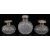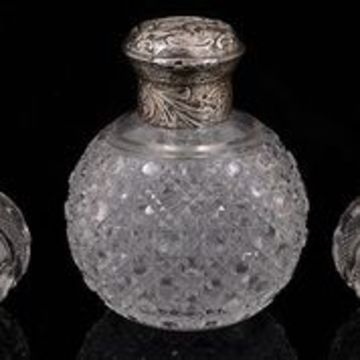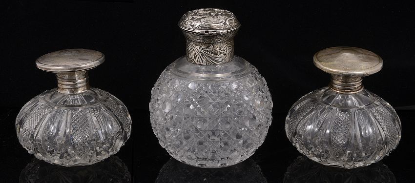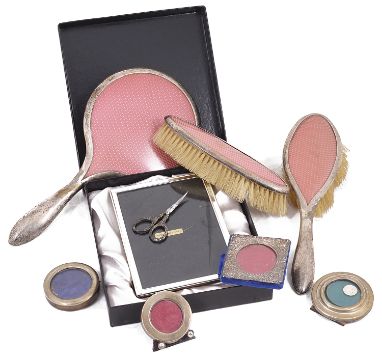 A mixed lot of silver to include silver topped cut glass scent bottles comprising a large Victorian scent bottle, London, 1887 by William Comyns and Sons, the mount embossed with a classical scene and foliate scrolling decoration and with pushbutton hinged cap, on an oval hobnail cut body, a pair of scent bottles, the screw fitting caps with linear engine turned decoration, marks rubbed, a three piece silver and faux pink guilloche enamel dressing table set, a modern silver photograph frame and four late Victorian and Edwardian miniature photograph frames , (qty) first height 12.5 cm Condition:  Overall fair condition. Comyns scent bottle the pin has sheared on the hinged cap. One of the pair of the scent bottles is missing internal stopper. One miniature frame with replacement stry back Another with slight dings to surround
