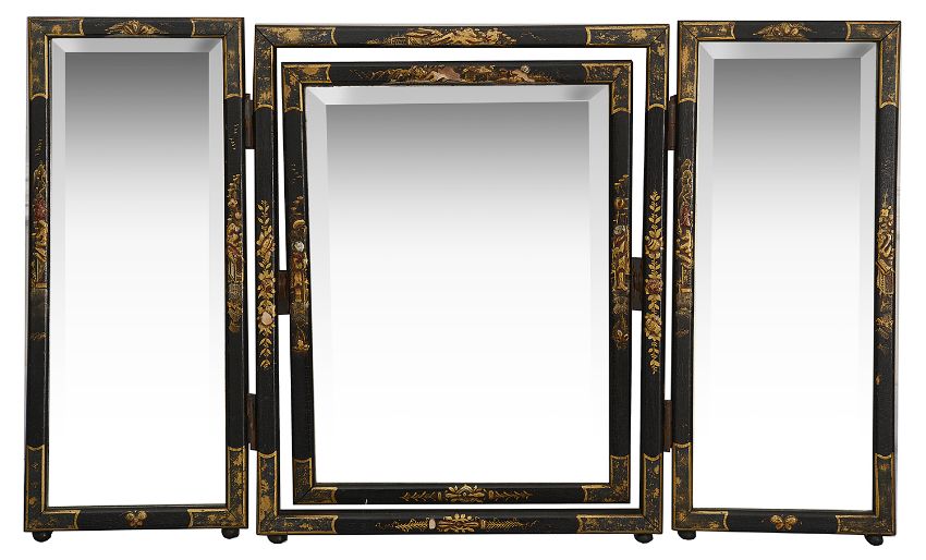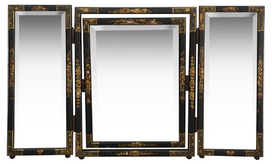 An Edwardian black japanned and gilt decorated chinoiserie triple dressing table mirror having bevelled mirror platesheight 50.5 cm., width approx. 72 cm.Condition: Two small areas of loss on central mirror frame, otherwise fair conditionPlease note that this lot needs to be collected and paid for by Friday 11th September 4:30pm