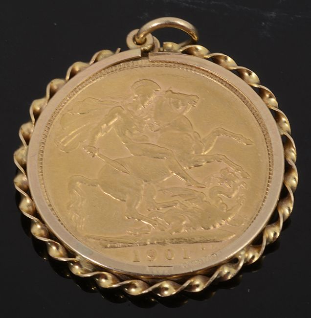 A Victorian sovereign dated 1901channel set to a 9ct gold pendant mount with a twisted rope borderTotal weight approx: 9.1gCondition: Wear to the sovereign