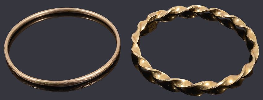 Two 9ct gold hollow banglesincluding an Italian flat section twisted example and another with a textured pattern (2)total weight approx: 10.3gCondition: Twisted example no obvious faults, the pattern bangle has a small dent and crack