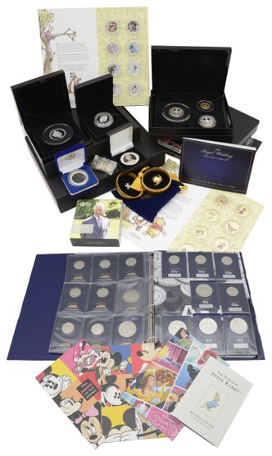 A large collection of silver and other mostly cased commemorative coinscomprising H.M The Queen's Coronation 65th Anniversary silver fifty pence set, HM Queen Elizabeth II & HRH The Duke of Edinburgh Platinum Wedding Anniversary fifty pence silver proof set, Royal Platinum Wedding silver Piedfort Crown, 2018 £5 silver proof Piedfort Coin celebrating the 70th Birthday of HRH The Prince of Wales, The Queens The Vale of Beaufort £2 Silver proof coin, England's Rose Princess Diana silver Proof crown with mother of pearl, Winnie the Pooh silver eight coin set, Peter Rabbit 1ozt limited edition silver ingot, Bradford Exchange the Queen Elizabeth II Sovereigns Orb Coin, 263/500, Tristan Da Cunha 65th Coronation Anniversary Ten Crowns. Queen Elizabeth 65th anniversary £5 proof coin and fourteen other £5 coins, The Diana Princess of Wales Five Crowns Coin, The 1953 Coronation year set, The 2019 Datestamp United Kingdom specimen year set etc., (qty)silver weight approx. 12ozt. Condition: Very good condtion