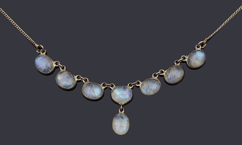A delicate Victorian moonstone drop necklacehaving seven spectacle set moonstones all joined by jump rings with a single moonstone drop, suspended on a silver chain with a later added bolt ring clasplength of chain approx: 41cmCondition: Replacement clasp, no obvious faults