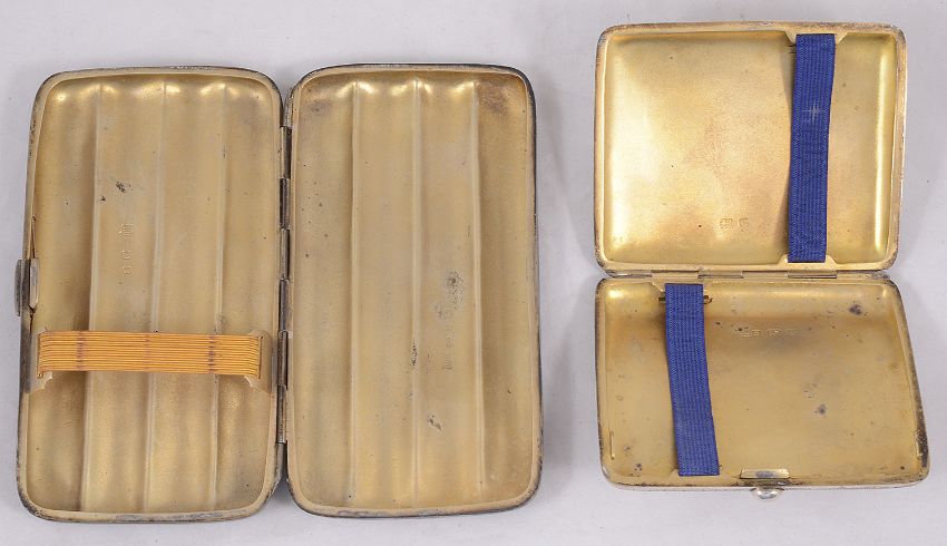 A late Victorian silver four division cigar case and Edwardian silver cigarette caseBirmingham, 1897 by Henry Charles Freeman, of rectangular form with engine turned decoration, bearing a shield shaped with initials, and having gilt interior, the cigarette case, Birmingham, 1902 by Clark & Sewell, of curved rectangular design with chased foliate decoration, engraved with initials and dated 1903, (2)first length 12.7 cm., total weight approx. 7.32 ozt.Condition: Cigar case with a small crack to right hand side of lid, initials rubbed in shield shaped reserve, some light surface corrosion to side of lid above hinge