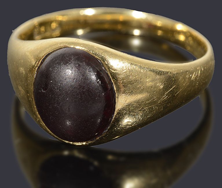 An 18ct gold ladies single stone signet ringan oval red cabochon possibly garnet rub set to a polished signet ringtotal weight approx: 4.4g, ring size KCondition: Cabochon has wear
