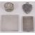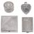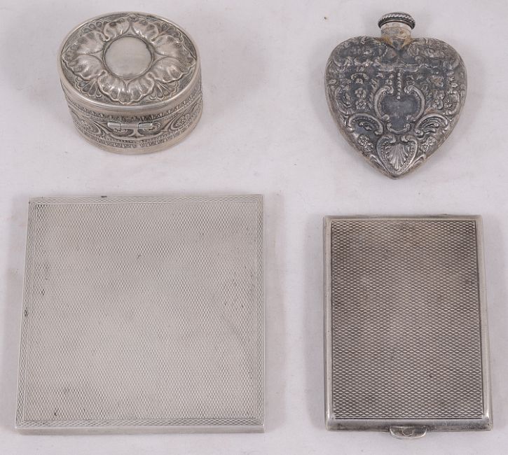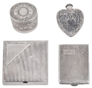 A Dunhill ladies silver compact and other silver itemsstamped 14k & sterling, London, 1947 by David Sutton & Sons, stamped Dunhill, of square design with engine turned decoration, bearing an applied plaque with presentation inscription together with an early 19th century probably French oval pot with a hinged lid, embossed with Empire style foliate decoration and bearing stipple engraved initials and dated 1839, an engine turned matchbook case bearing initials and a foliate embossed heart shaped scent bottle, stamped sterling, (4)first width 6.5 cm., Total weight approx. 5.71 ozt.Condition: The compact has a later plaque applied to the hinged lid with presentation inscription. The push clasp is damaged so the lid does not close. The push clasp is also a later replacement of the original which was most likely the 14k element. The other items are in fair condition