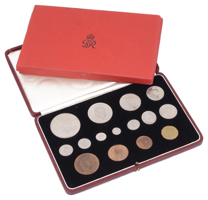 George VI 1937 15 coin Coronation proof set crown to farthing including Maundy set, in original tooled leather presentation case and with cardboard holder and outerCondition: Fine