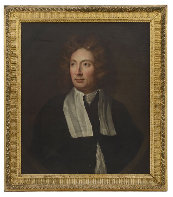 18th Century English School'Half length portrait of a cleric', wearing a shoulder length curled wig, in black robes his bands untied and robes unbuttoned, within an oval, oil on canvas, carved giltwood framecanvas 76 x 64 cm., overall 91 x 79 cm.Condition: Condition commensurate with age. Craquelure to face and bands. Frame with rubbing a minor losses