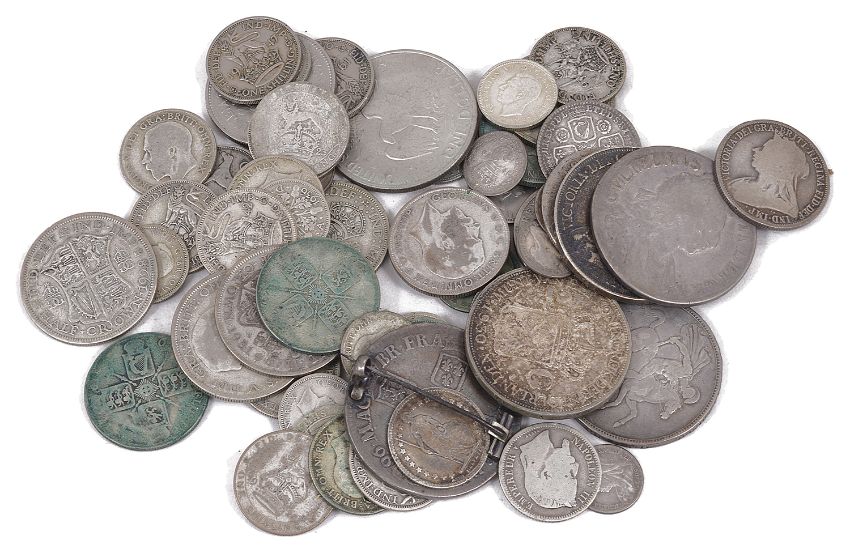 A selection of mostly British silver coins to include crownsto include two William III crowns, 1696, one adapted as a brooch, a George II shilling, 1745, a George II silver sixpence, a George IV crown, 1822, a Victoria Crown 1895, together with a small quantity of foreign and pre 1920 silver coins to include a Netherlands Willhelmina 2-1/2 Gulden, 1930, and a small quantity of pre 1947 silver coins, etc. (qty)Weight of pre 1920 coins approx. 6.95 ozt., pre-1947 total weight approx. 3.66 ozt. Condition: Circulated, some worn. Viewing recommended in person