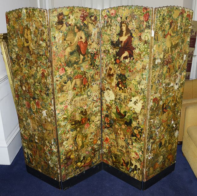 A Victorian four fold draught screen decorated with Japanese figures painted on linen and decoupage the arched panels decorated with a full length figures of geishas and and a male attendant bearing a tray with sake bottle and cups, within floral decoupage and stamp collage bordersheight 152 cm., width 183 cm. Condition: Some rubbing to painting. One panel with a small tear approx. 5 cm and several missing stamps, slight loss near bottom hinge. Reverse outer panels with tears and losses to decoupagePlease note this lot needs to be collected and paid for by Friday 11th September 4:30pm