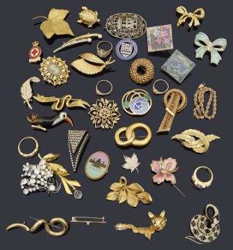 A collection of interesting brooches and ringsto include an Art Deco painted black and diamante triangular brooch signed J. Ryaw, a paste stone spray brooch circa 1950s, a gilt metal oval enamel brooch inlaid with a 'Dean College' and an image of the building, a gilt metal French poodle brooch with mink hair body, a bakelite Scottie and Westie brooch, two lucite reverse painted intaglio brooches and a silver simulated pearl and paste marcasite shaped ring together with other brooches (qty)diamante spray brooch: approx 5.5cm in lengthCondition: All in good condition but have signs of wear. The art deco brooch has its pin deficient