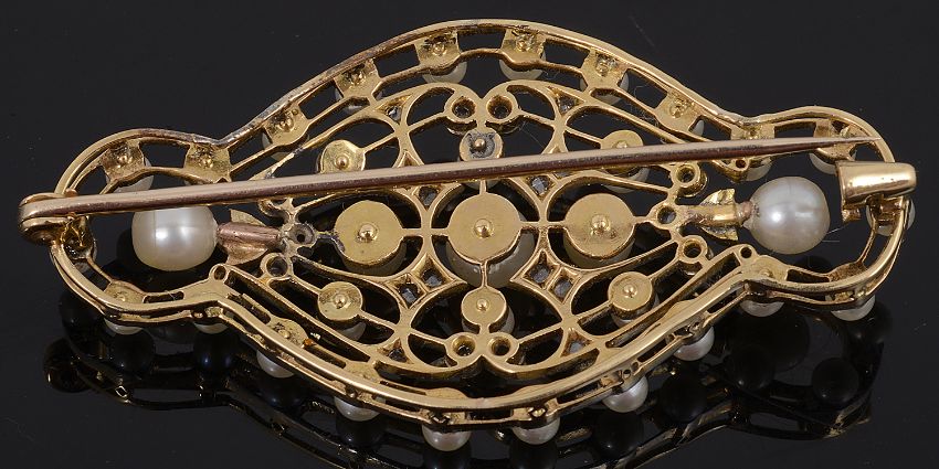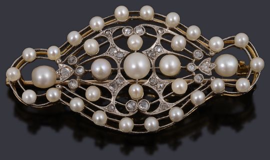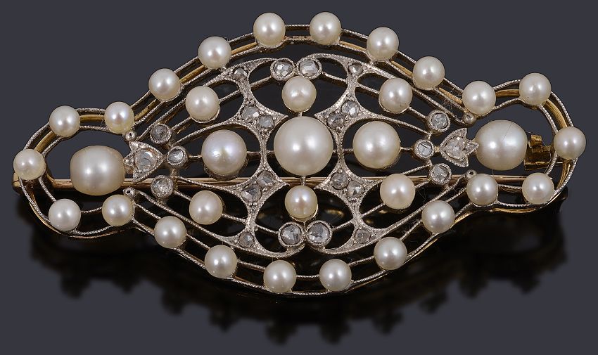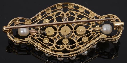 An beautiful Edwardian gold diamond and pearl brooch circa 1900having a white open-work scrolling frame, set with cultured pearls and highlighted to the centre with rose cut diamond accents, with gold reserve, pin and cap claspTotal weight approx: 10.0g, size approx: 5.2cm acrossCondition: Has had a small repair to the frame work and two pearls replaced at the end of the trio of central pearls