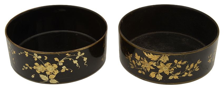 A pair of Regency black japanned and gilt chinoiserie decorated papier mache bottle coasters c.1820, (2)