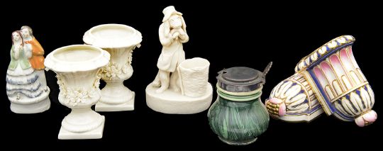 A small varied collection of 19th century and later ceramicscomprising a pair of Mintons small polychrome and gilt fluted wall brackets, a Copeland parian figure of a dog in clothing standing by a basket, a bargeware teapot, a pair of small Capodimonte porcelain urns encrusted with garlands, a novelty tobacco jar, a Quimper crescent shaped inkwell, a malachite ware mustard pot with EPNS mount, two wall pockets, etc., (qty)first height 9.5 cm.Condition: Good condition