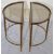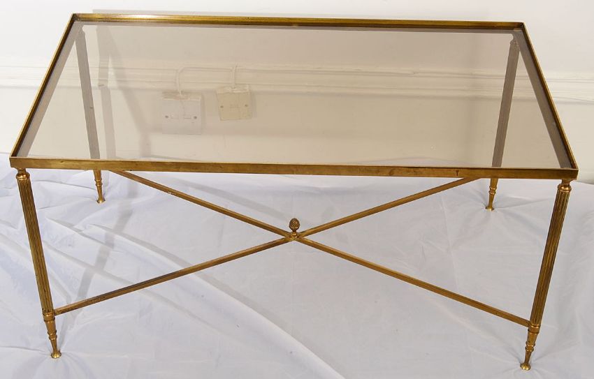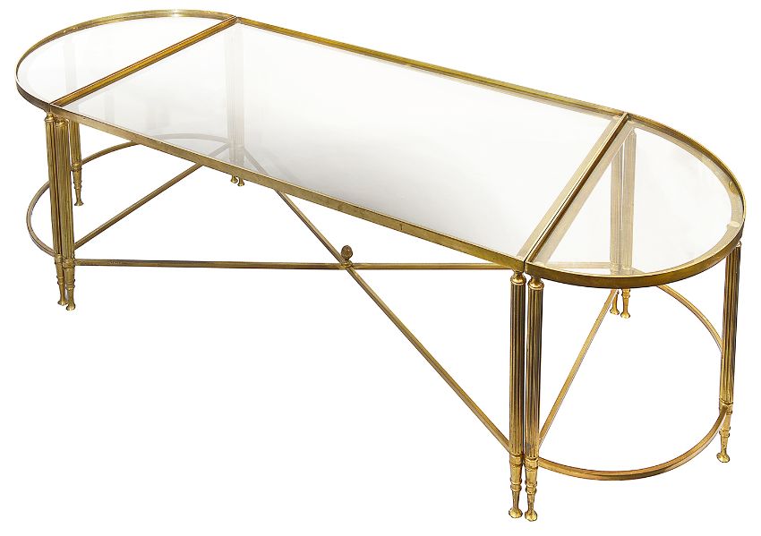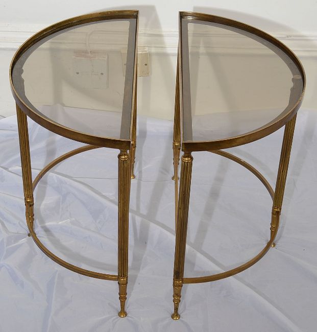 A lacquered brass and smokey glass set of three low occasional tables on reeded column supports comprising a rectangular table and a pair of demi lune shaped tablesheight 44 cm., overall length 124 cm., depth 40.5 cm.Condition: good condition. Some wear to lacquering Please note this lot needs to be collected and paid for by Friday 11th September 4:30pm