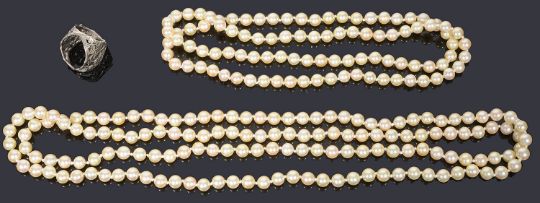 Two single row cultured pearl necklaces,both strung knotted to a continuous form together with a silver scarf ring (3)Approx length: 115cm (opera length) and 72cmCondition: good order,