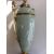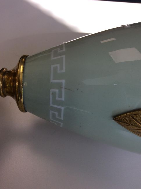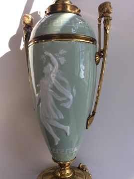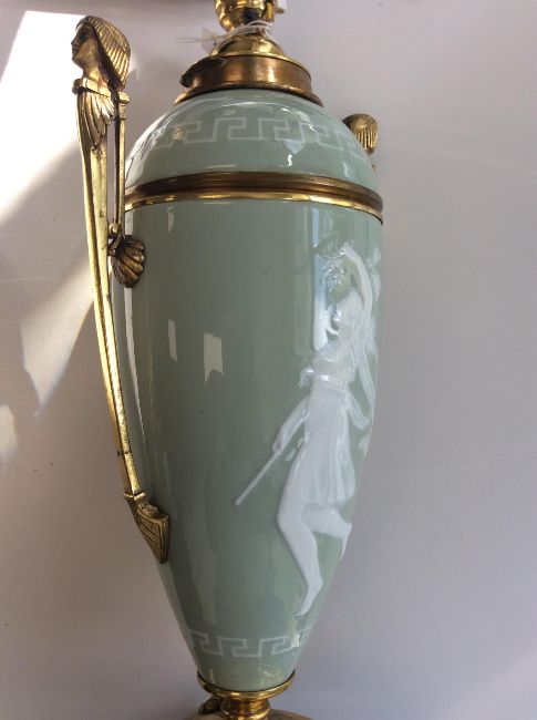 A late 19th century French pate-sur-pate ormolu mounted Empire style table lamp of tapering ovoid form, decorated with a bacchante in flowing drapery against a celadon ground, mounted with twin mask handles and raised on a foot, fitted with an oil reservoir stamped Hinks & Sons, later adapted for electricity