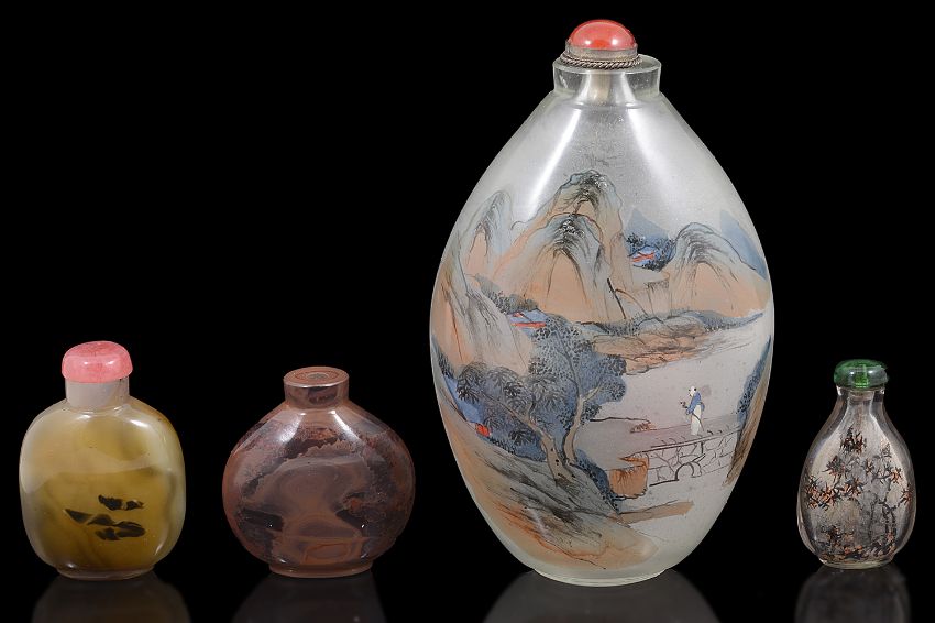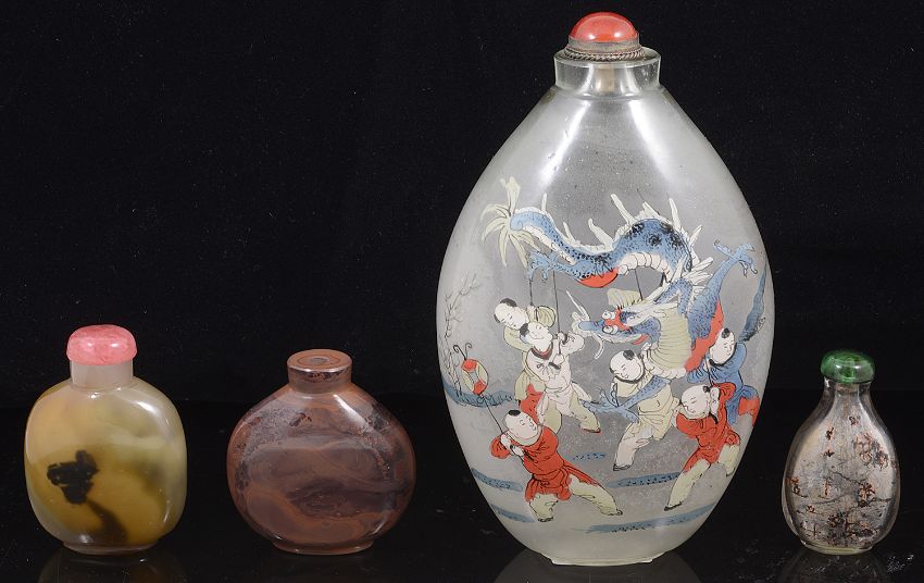 A large early 20th century Chinese inside painted glass snuff bottle and three othersthe first painted with a dragon and dancing boys, obverse with a figure on a bridge and a landscape together with two coloured glass snuff bottles and a small inside decorated example (4)first height 17 cm.Condition: First with absent stopper stopper. One stopper is absent