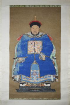 A 19th century Chinese hanging scroll ancestor paintinggouache on paper, depicting a seated mandrinpainting 47 x 91 cmCondition: Tear near mandarins left arm approx. 10 cm. Some areas of fading to mandarins robes. Some foxing to scroll margins