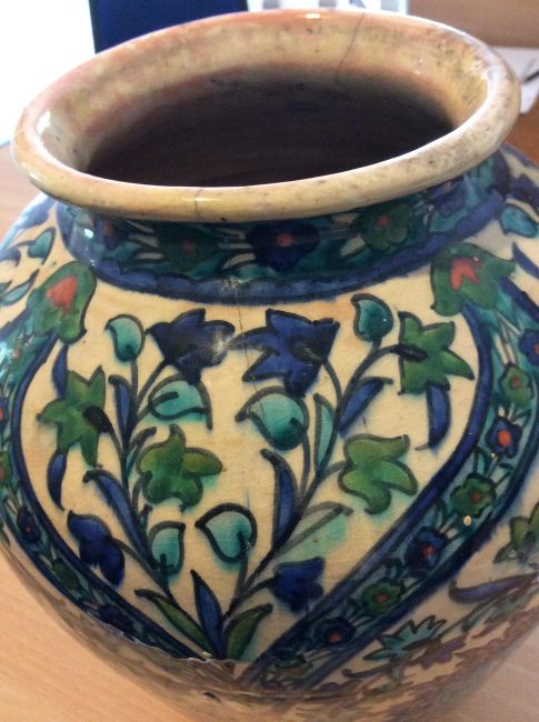 Condition: Fair condition. Two hairlines travelling from rim down to shoulder of vase