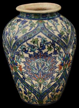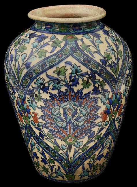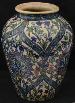 A large 19th century Iznik pottery polychrome tin glazed vase of shouldered tapering form, decorated in red, green and tones of blue with large flowerheads within arabesques against a dense field of flowers