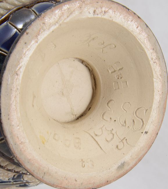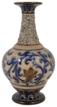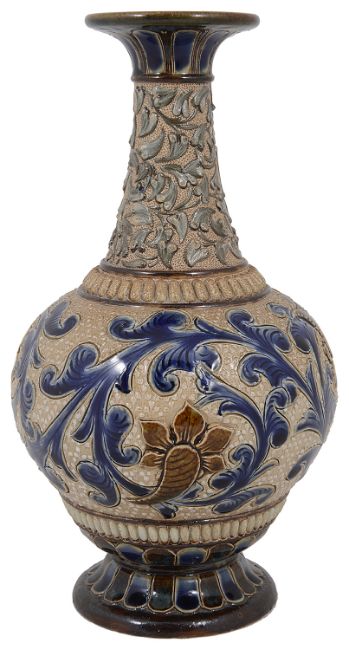 A Doulton Lambeth vase decorated by Emily S. Stormer, with incised foliate design, and relief leaf pattern design to neck against a fawn ground, of squat baluster form, with initials and impressed factory marks to baseheight 20cmCondition: In good overall condition with no obvious damage