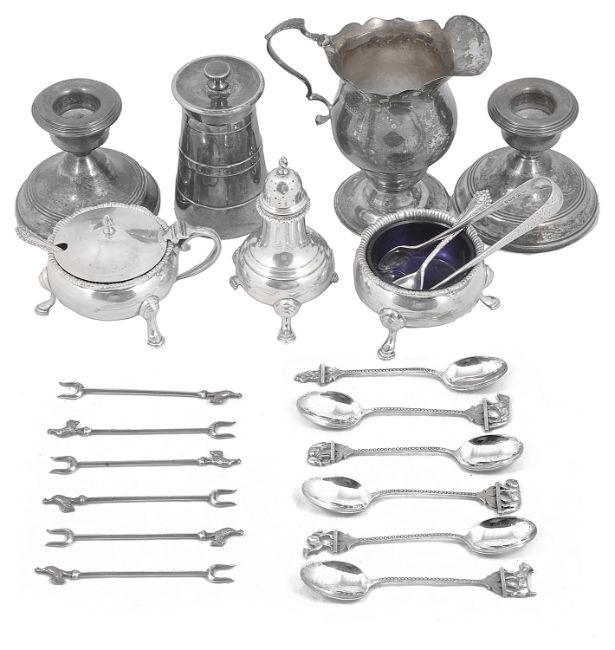 A mixed lot of 20th century silver comprising a George V cream jug in George III style, London, 1921 by The Goldsmiths & Silversmiths Co. Ltd, of ogee form, having wavy edged and scroll handle, on a domed spreading foot, a three piece cruet set in Georgian style, London, 1949 by Edward Barnard & Sons, fitted with blue glass liners, a pair of squat dwarf candlesticks with weighted bases, set of six cocktail sticks with cockerel terminals, stamped Sterling Silver, a set of six white metal coffee spoons with animal terminals, a pair of sugar tongs and a silver plated milk churn pepper mill, stamped Mappin & Webb, (qty)first height 10.5 cm., total weight approx. 14.7 ozt Condition: Overall in fair condition. Several black spots to interior of cauldron salt. Otherwise items in fair condition