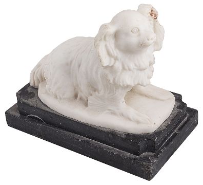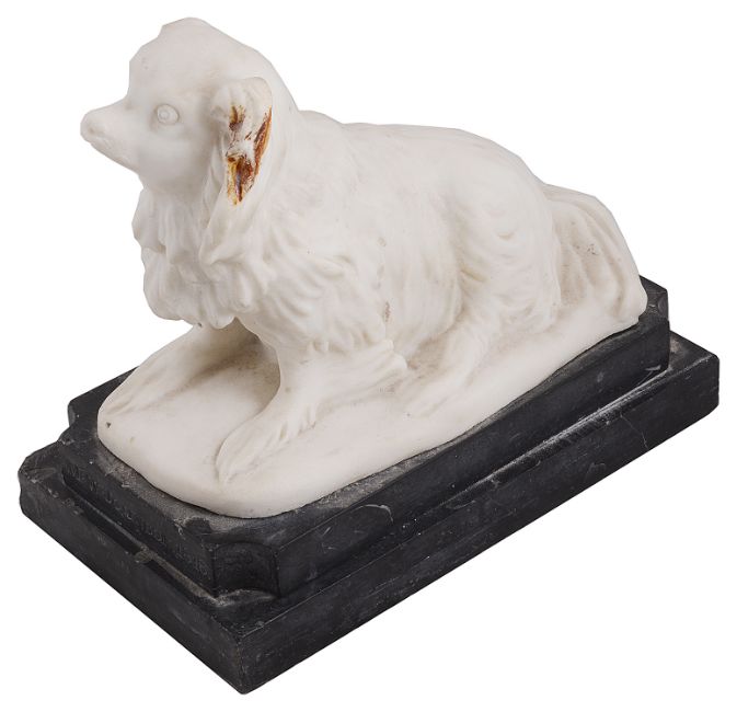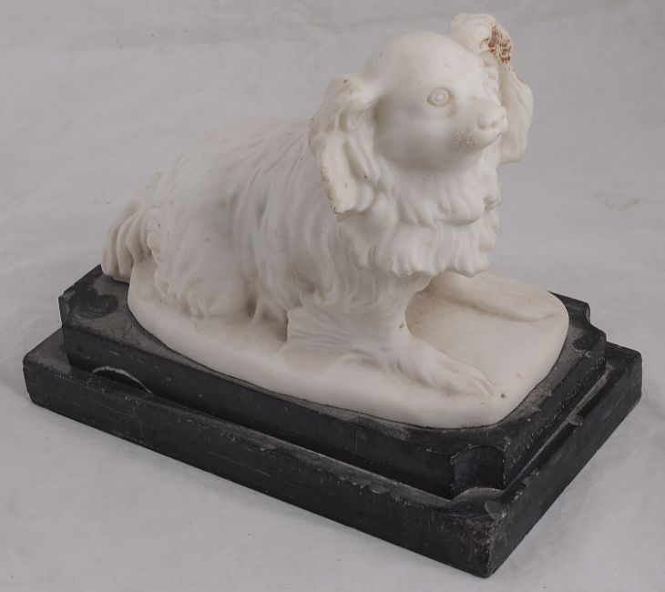 Matthew Warton Johnson (British 1800-1881)A carved marble of a toy dog sat on its' haunches, on stepped white veined grey marble, plinth base, signed M W Johnson, 1818height 22.5 cm., , width 15.2 cm. depth 26.5 cmCondition: Fair condition. Slight scratches around muzzle. Small chips to plinth edges in several places. Slight staining to right ear which would presumably be removed with a cleanThe monumental mason and sculptor Matthew Wharton Johnson was one of the many statuaries who made white-on-black funerary panels in the 19th Century, but his work is above the usual standard, and almost always includes at least some carving. There are a variety of his works in churches in and around London. However, M.W. Johnson’s monuments are found across England and Wales, and odd examples have been identified as far afield as Australia, India, and Barbados. M.W. Johnson also made garden sculpture – fountains, ornamental vases, Classical figures etc. In the 1830s, he took out a patent for the improvement of the construction of coffins, and he is listed then as ‘Sculptor and Stone Mason, of Buckingham Place, Middlesex’ –Buckingham Place being just to the west of Fitzroy Square, and now called Cleveland Street. His address for most of his long working life was close by in New Road, Fitzroy Square, Euston Road.