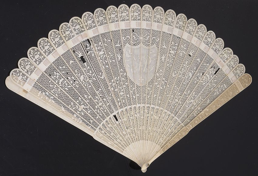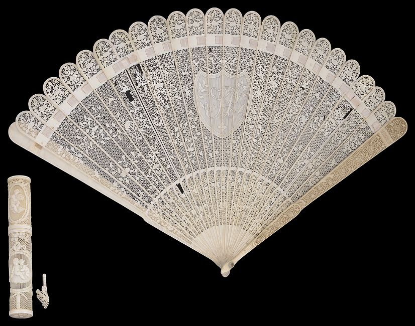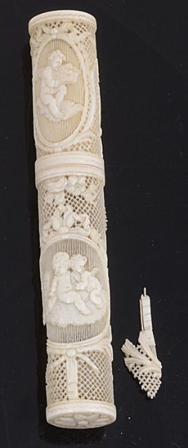 An early 19th century Chinese export Canton carved ivory brise fan and an early 19th century French carved ivory bodkin casethe first with the outer guards finely carved with flowers and scrolling foliage, the twenty three inner sticks with rounded tips carved and pierced with birds, butterflies, flowers and foliage and leaves, centred with shield bearing the initials J P, second a/f , probably Diepppe, of cylinder form, finely carved with oval reserves with putti and scroll framed panels with musical instruments and flowers baskets against a reticulated ground, (2)first length 26.5 cm.,Condition: Tips of two sticks broken. Several small areas with losses. Second with one area of principal damage. Three pieces of damaged area present but with some losses