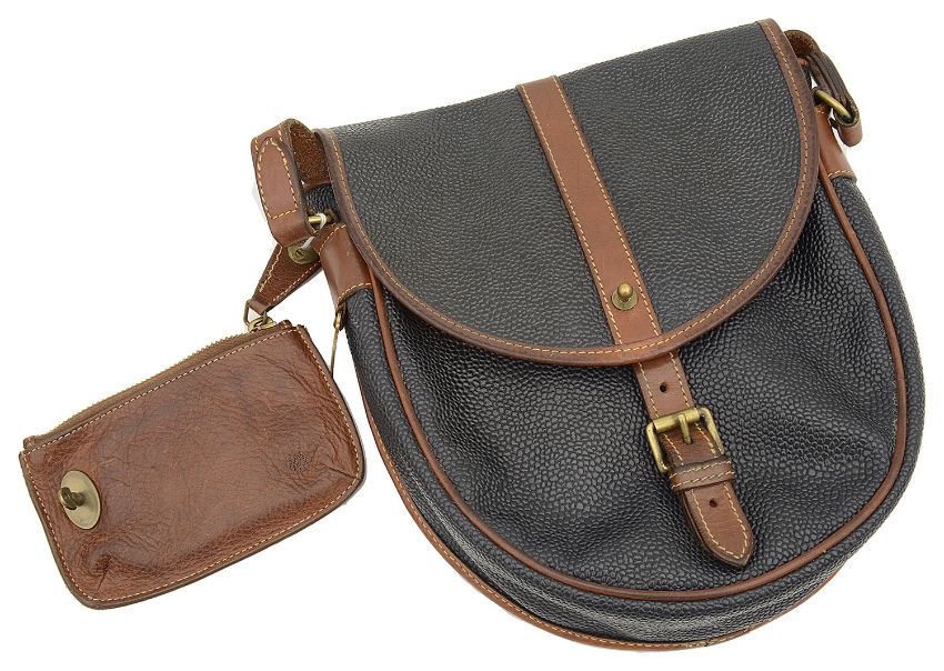 A vintage Mulberry navy scotchgrain and leather crossbody handbag,with tartan interior and brass hardware, authenticity code 544649 together with a small Mulberry brown wallet (2)handbag approx: 26cm x 22cm, wallet: 9cm x 14cmCondition: Some wear to both, signs of use for example a natural tanning to the brown leather, interior clean.
