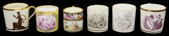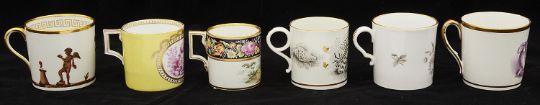A collection of 19th century porcelain coffee cans to include Meissen comprising a Meissen yellow ground coffee can painted in carmine with two putti within an gilt oval border, a Coalport (?) can painted in bronze and gilt with classical figures, a Worcester Flight Barr & Barr can bat printed in black with shells, a Miles Mason can bat printed in carmine with children at play a Spode can bat printed with flowers and a Meissen 'Watteau' can, (6)