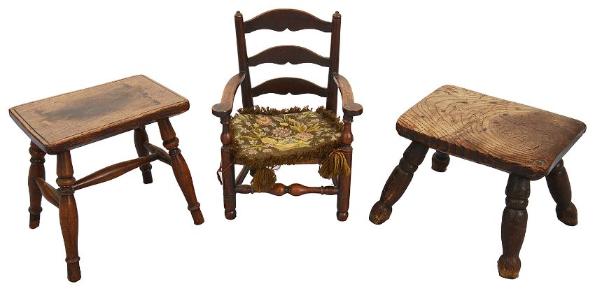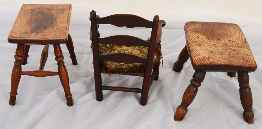 A late 19th century miniature tradesman's sample stained beechwood rush seated Lancashire ladder back armchair together with two 19th century rustic stools one stool with elm seat on splayed turned ash legs, the other beechwood on splayed legs united by an H stretcher, (3)height 30.5 cmCondition: Sample ladderback with distressed rush seat. Old worm to rear of front right leg. Historic repair to one foot with historic repair. old worm holes to side bar of h stretcherPlease note this lot needs to be collected and paid for by Friday 11th September 4:30pm