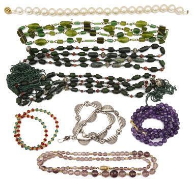 A collection of interesting necklaces and braceletsto include two Art Deco green glass, moss agate and bloodstone bead necklaces with silver spacers terminating with silver ball beads and green fabric tassels, a long green glass bead necklace each bead joined by jump rings circa 1920, an Indian single row red and green glass bead necklace with gold coloured spacers between, a silver coloured modernistic necklace, with semi-circular shaped fringe beads, a four row amethyst bead bracelet and a diamante bracelet circa 1950s (qty)Art deco bead necklace approx: 39cm in lengthCondition: All in good condition. please ask for a condition report on individual items