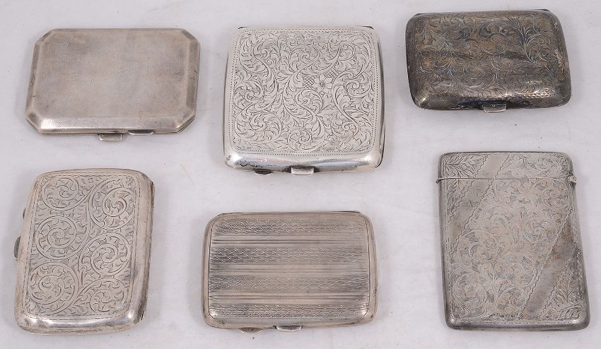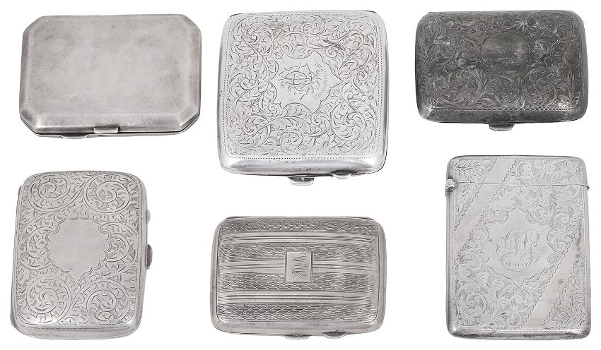 An Edwardian silver card case and five silver cigarette casesthe card case, Birmingham, 1909 by Joseph Gloster Ltd, of rectangular form with hinged lid with foliate engraved decoration, the central reserve engraved with initials and dated 13.11.17 together with four curved mostly foliate engraved case and a plain example, (6)first length 9.7 cm., total weight approx. 13.98 ozt. Condition: Overall fair condition commensurate with age and use. Some pushing to sides of card case. Two curved case bearing initials. Plain example with scratches and wear