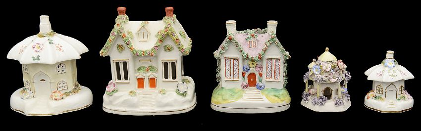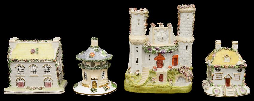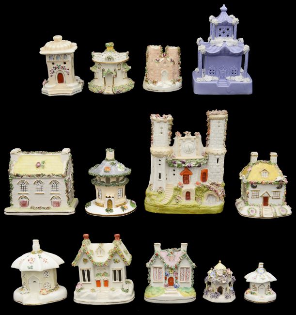 A collection of early to mid 19th century English porcelain and Staffordshire pottery flower encrusted pastille burners in the form of cottage or lodges and a Staffordshire chapel money boxto include a lilac coloured cottage pastille burner with pagoda roof and Solomonic columns, an inkwell in the form of a round cottage with lift off roof, a cottage money box, a flat back castle spill vase etc., (13)lilac pastille burner height 17 cm. Condition: Mostly good condition. Small castle pastille burner with restoration to foot. Octagonal lode burner with restoration to foot.