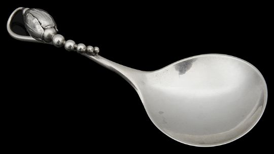 A Danish Sterling silver caddy or jam spoon by Georg Jensen in the blossom pattern1945-1951, design number 84, the reverse of the bowl stamped Georg Jensen & Wendel, the handle with blossoming pod finialweight 0.56 oztCondition: In good overall condition with no obvious damage
