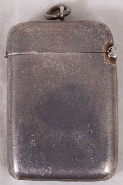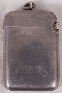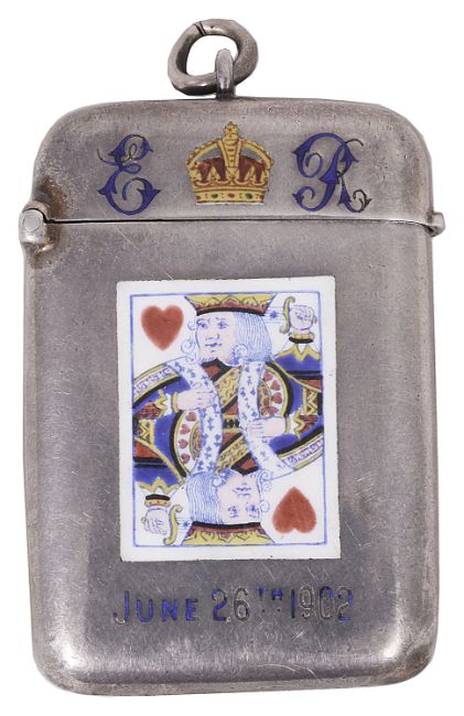 An Edward VII Coronation Souvenir enamel vesta caseChester, 1901, by John Milward Banks, Stamped with Banks flower trademark of rectangular form with rounded cornerstone hinged cover with a suspensions ring, the front enamelled with a royal crown between E R and with a playing card, the king of hearts beneath the date June 26th 1902length 5.5 cm., weight approx. 1.5 oztCondition: Overall good condition. Slight loss to enamel on the date, otherwise with light surface scratches commensurate with age