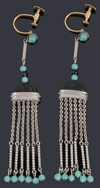 A pair of Art Deco white metal fringe drop earringshaving green glass and onyx beads suspended to a onyx fluted dome, with white metal fringed tassels terminating with green glass beads, with screw back fittinglength approx. 7.5cmCondition: Possible later fittings but no obvious faults