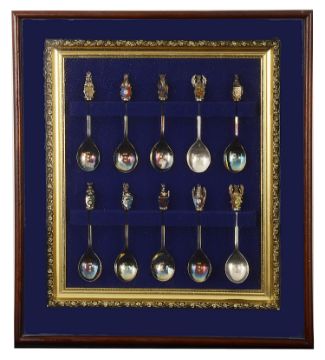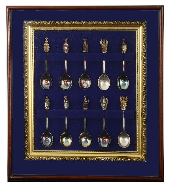 'The Queens Beasts Collection', a limited edition set of ten silver and enamel spoons Birmingham, 1977 by Toye, Kenning & Spencer, Ltd, in a glazed display case, (10)length 14 cm., total weight approx. 15.35 ozt.Condition: Good condition