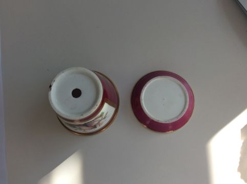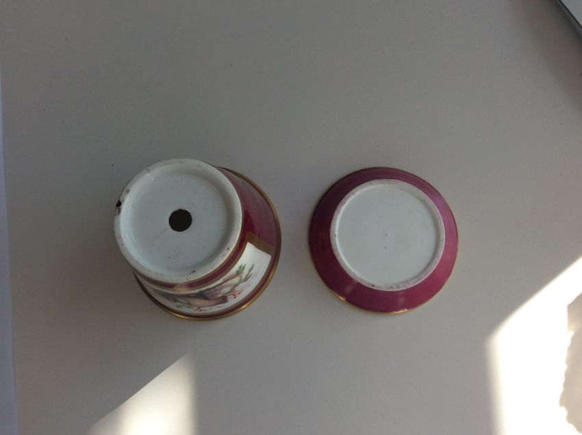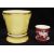 Condition: Small chip to underside of yellow ground cache pot. Slight chip to inner rim of socle stand. Some wear to gilt. The smaller cache pot with some scratches to claret ground