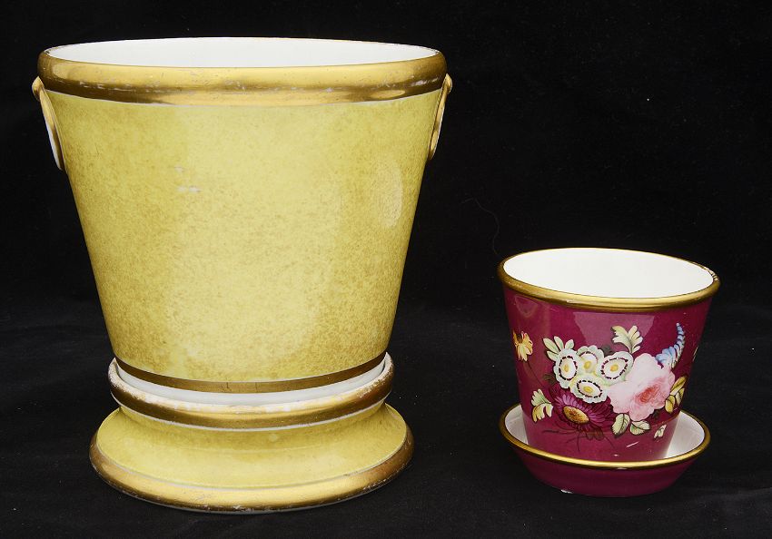 Two early 19th century English porcelain cache pots and stands the first c.1820, possibly Coalport, of bucket form with gilt rims and applied ring handles, painted with a panel filled with flowers, within a powder yellow ground, on a socle stand, together with a small cache pot on stand painted with a panel containing seashells, the reverse with a bouquet of flowers, on a claret ground with gilt borders, (4)