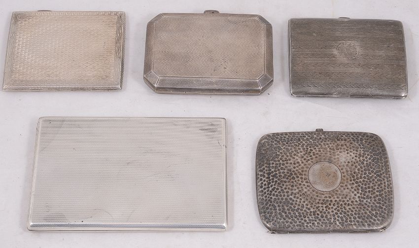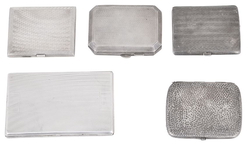 Five early 20th century silver cigarette casescomprising a a large rectangular engine turned Art Deco example, Birmingham, 1937 by Dudley Russell Howitt with sliding action, together with three smaller cases with engine turned decoration and an Arts & crafts case with planished decoration, (5)First length 12.7 cm., overall weight approx. 17.22 ozt. Condition: Good condition commensurate with age and use