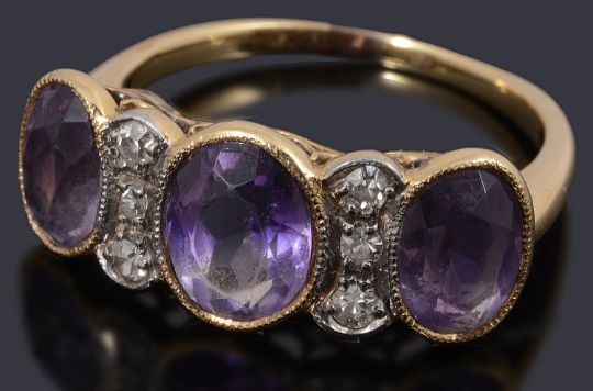 An unusual gold amethyst and diamond three stone ringthree oval cut amethysts millegrain set with six eight cut diamonds points, grain set to white plaque, to a pierced gallery and a plain polished shanktotal weight approx: 4.0g, ring size approx: OCondition: Some facet wear to the amethysts, the shank has been resized at some point and has a joining marking of a lower carat, overall tests as approx 18ct gold